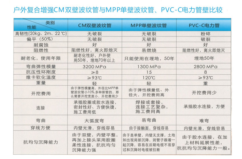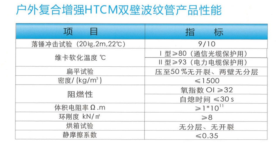 能新型管道。产品按结构分为:户外复合增强HTCM实壁管和户外复合增强HTCM双壁波纹管;产品按用途分为:型和I型,I型为通信光电缆保护用,II型为电力电缆保护用。